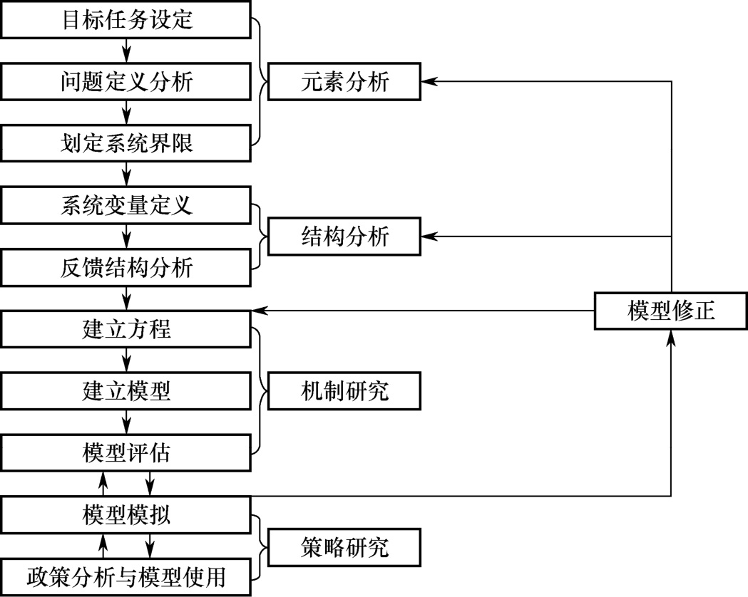 智慧政务信息生态将随着时间的变化呈现出特有的演化特征。因此,如果将构成元素、行为主体、作用关系考虑在一起,再加入时间因素,系统动力学模型将展现智慧政务信息生态发展的动态机制,本书要探索和研究的主要过程,即智慧政务信息生态协同演化机制研究建模过程如图2-1所示。