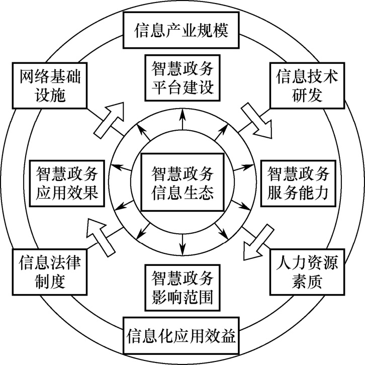 随着中国不断推进信息化建设,基于互联网环境的智慧政务信息生态环境不断完善。智慧政务的发展要求逐步建立以互联网为基础、政府与企业相互配合、综合运用多种技术手段,满足公民和企业服务需求的智慧政务信息生态体系 [66,67] 。为此,本书将以信息生态理论为基础,分析智慧政务平台建设、智慧政务服务能力、智慧政务影响范围、智慧政务应用效果之间的作用关系。在此过程中,将综合考虑网络基础设施、信息产业规模、信息技术研发、人力资源素质、信息化应用效益、信息法律制度等因素,具体如图2-2所示。