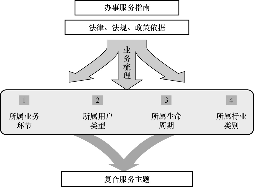 按包含关系,服务主题分为复合服务主题和原子服务主题。包含其他原子服务主题的服务主题称为复合服务主题。然而,这是一个相对的概念,复合服务主题包含若干相关的原子服务主题,凡是被包含在复合服务主题中的服务主题都被称为原子服务主题。复合服务主题的设置同样需要通过对智慧政务网站的办事服务资源进行调研,并且综合考虑办事服务资源所属业务环节、用户类型、生命周期、行业类别等因素进行复合服务主题组合,形成服务主题设置建议,如图3-2所示。
