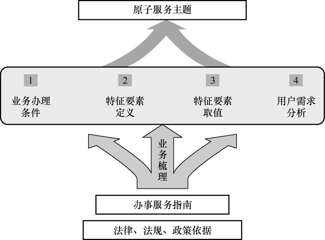 服务主题是由功能类似或业务相关的服务事项、在线服务资源、业务数据、业务逻辑和展示页面等要素组成的。在所有的服务主题中存在这样一类主题,它的特点是,在业务层面上不能包含其他任何一个子服务主题,称为原子服务主题。对原子服务主题的梳理,应当通过对智慧政务网站办事服务资源的调研,按照业务办理条件、特征要素定义、特征要素取值、用户需求分析等梳理方法,根据在业务层面上不能包含其他任何一个子服务主题的原则,对服务主题进行梳理细分,形成互不交叉、互不兼容的原子服务主题,如图3-1所示。