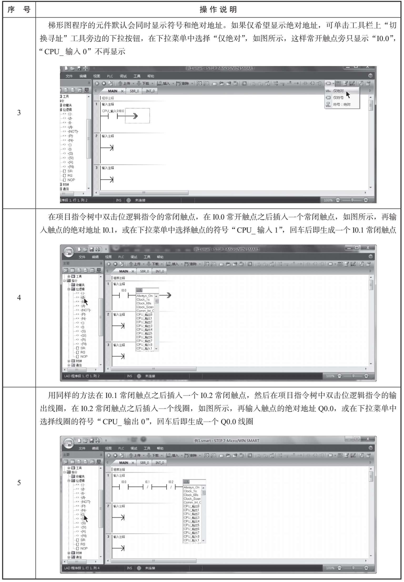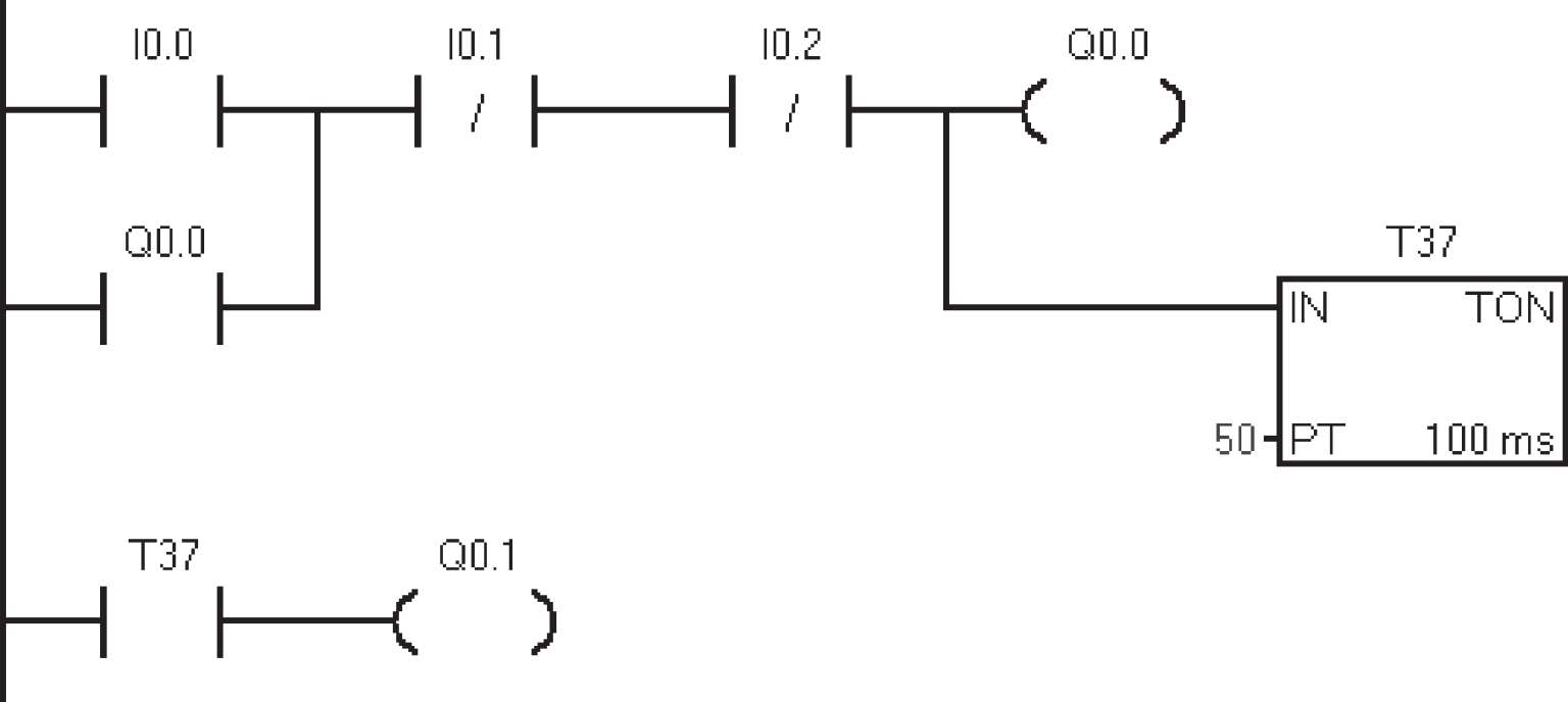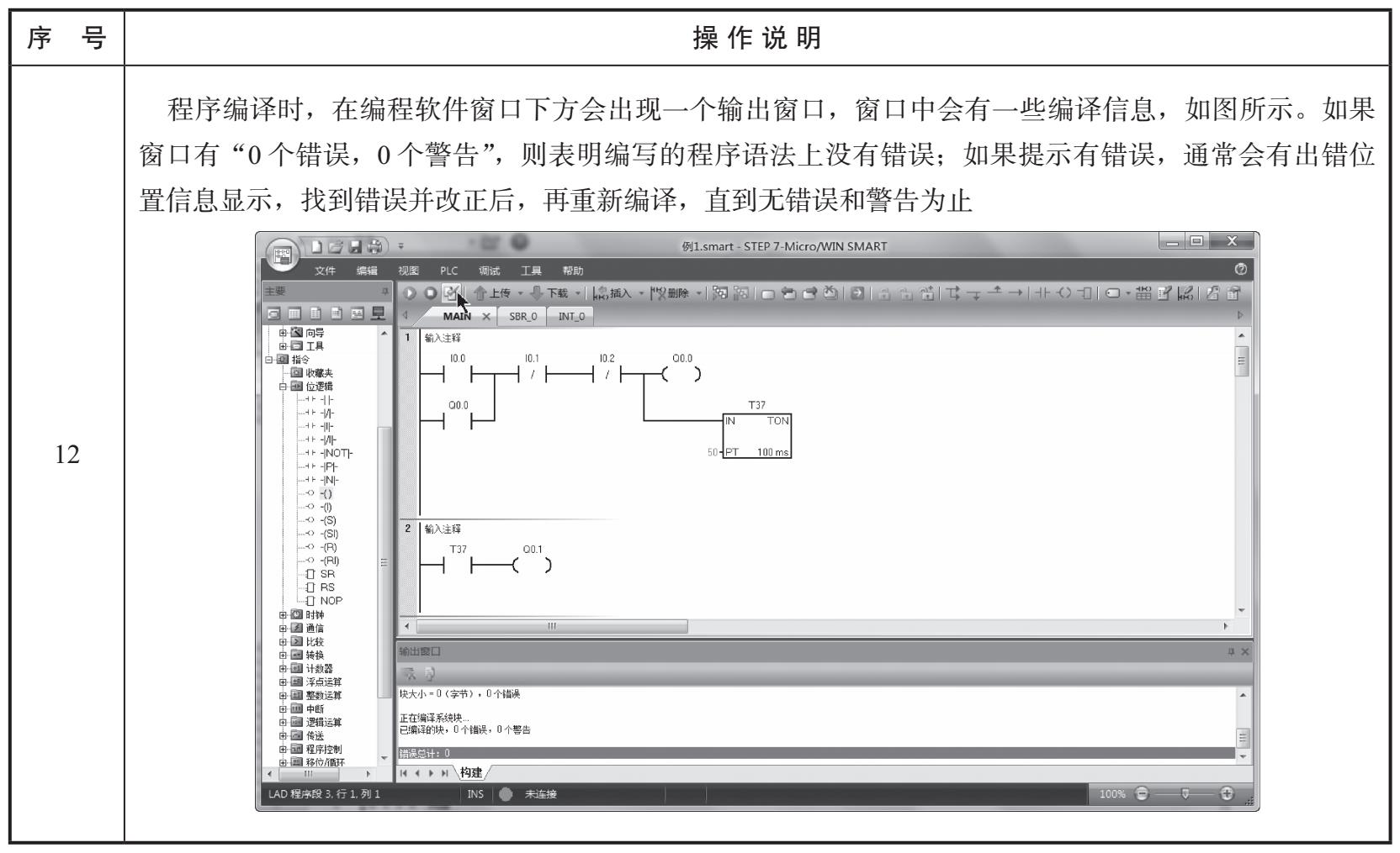 下面以编写图3-11所示的程序为例,来说明如何在STEP 7-Micro/WIN SMART软件中编写梯形图程序。梯形图程序的编写过程见表3-1。