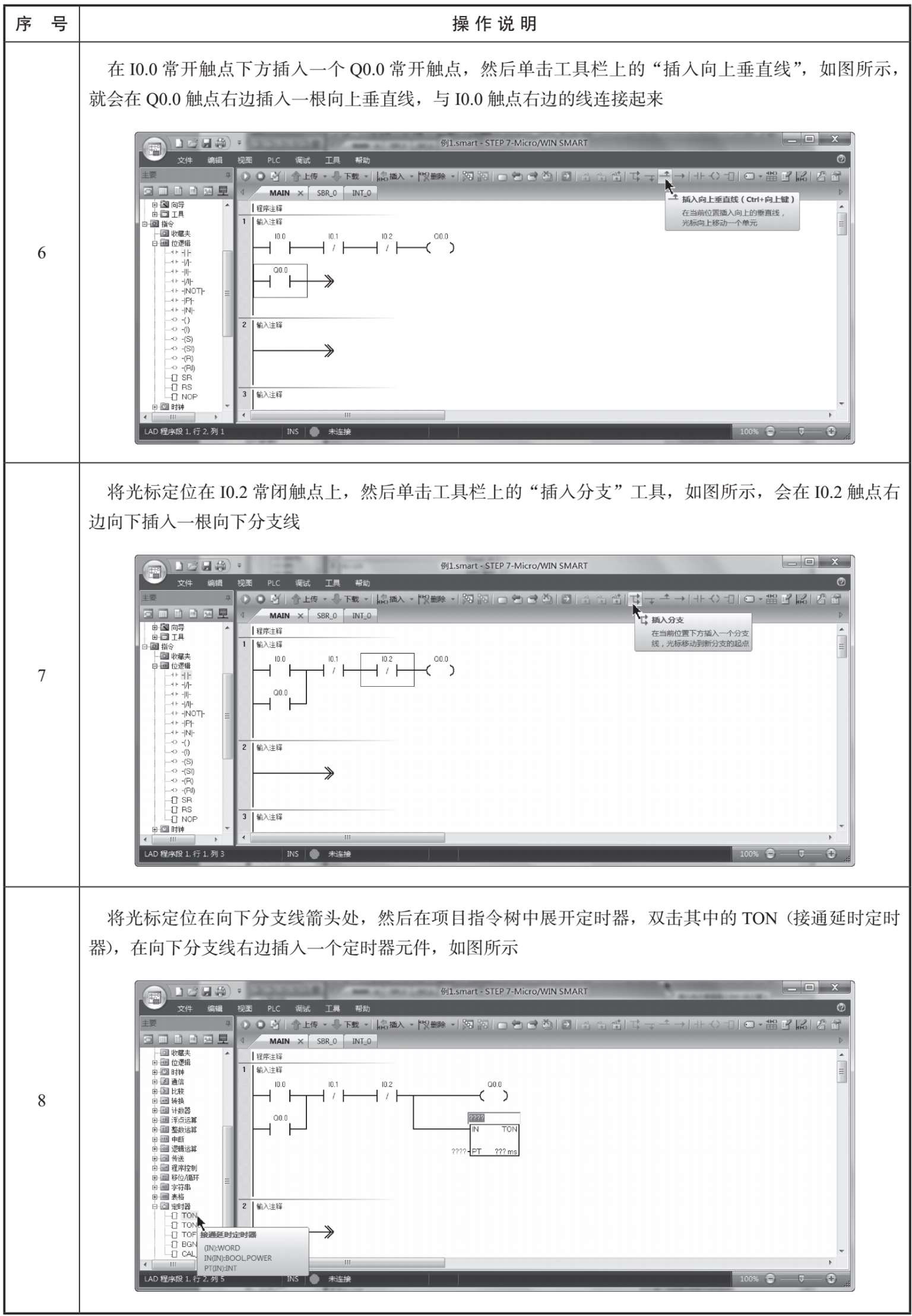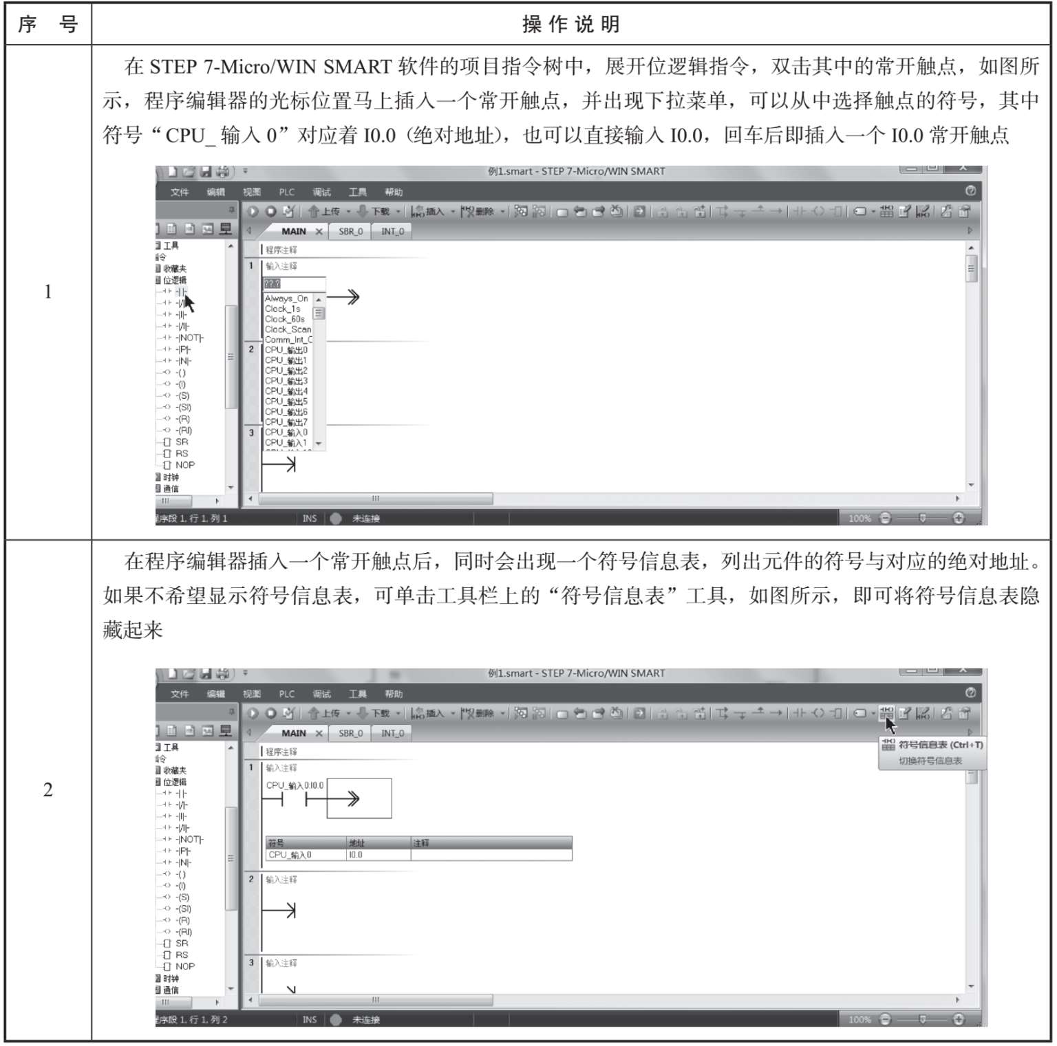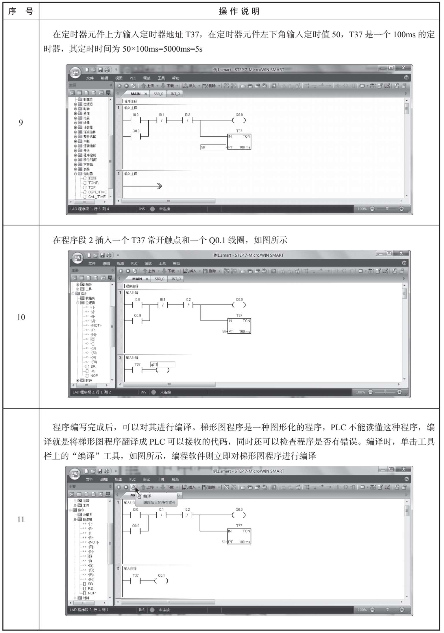 下面以编写图3-11所示的程序为例,来说明如何在STEP 7-Micro/WIN SMART软件中编写梯形图程序。梯形图程序的编写过程见表3-1。