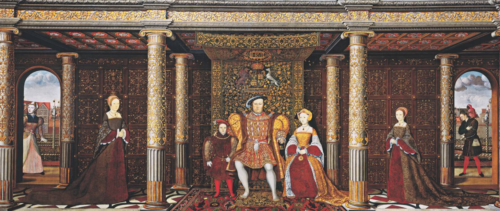 亨利八世的家庭,1545年。这幅肖像可能是为了纪念国王恢复两个女儿玛丽和伊丽莎白(分别位于左边和右边)的继承权而安排绘制的。亨利的儿子和继承人爱德华坐在他的右边,而简·西摩尔(八年前去世)在他的左边。