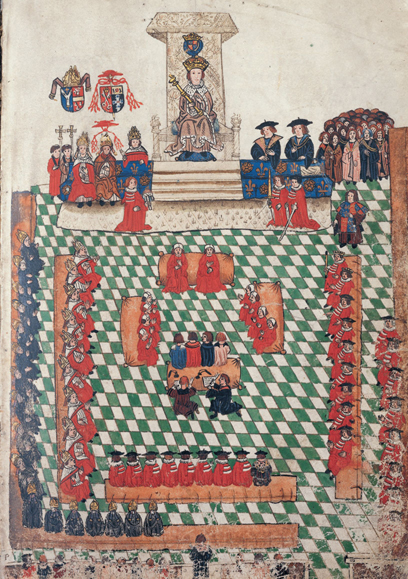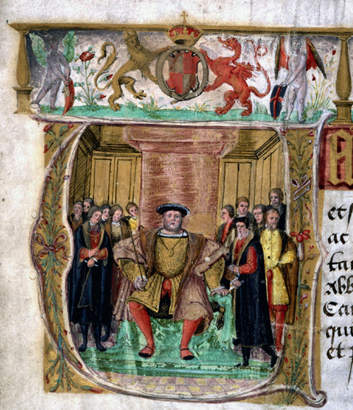 议会上的亨利八世(1491—1547)。这次议会于1523年4月到8月召开,是克伦威尔参加的首次议会。因为那时他是无名小卒,所以不大可能出现在这幅插图中,这幅插图选自《赖奥思利嘉德书卷》。可以看到他的侍主托马斯·沃尔西位于国王的右边,头上戴着枢机主教的帽子。