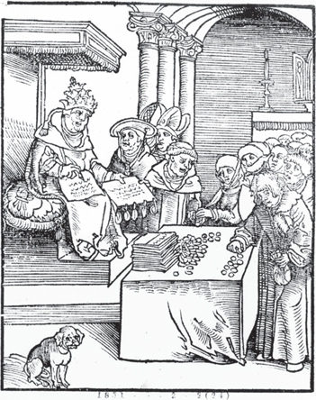 教宗出售赎罪券,1521年。摘自菲利普·梅兰克森(Philipp Melancthon)的《狂热的基督徒与反基督徒》。菲利普是一位重要的改革主义者和出售赎罪券的批判者。