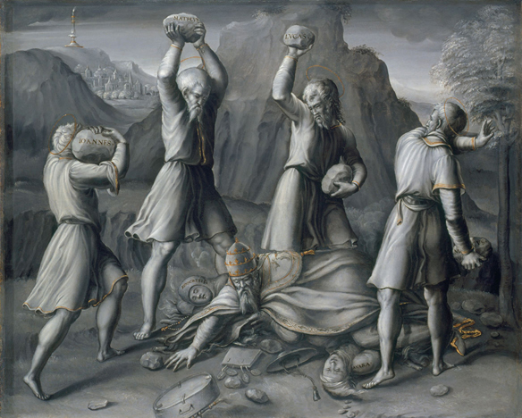 四位《圣经·新约》福音书的作者正在用石头砸教宗,这是吉罗拉莫·达·特雷维索(Girolamo da Treviso)于1538~1540年创作的。