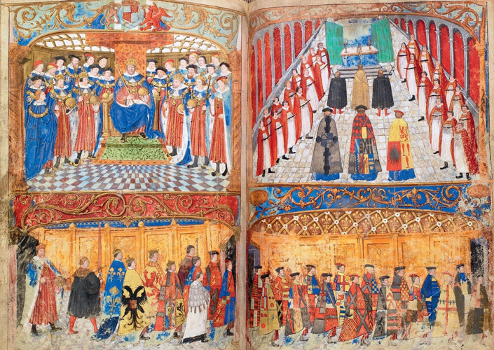 嘉德登记册,记录了1534年的嘉德仪式。在左上方,亨利八世坐在王位上,身边围绕着嘉德骑士。在接受勋位时,据说克伦威尔“竭尽雄辩所能”发表了一席感言。