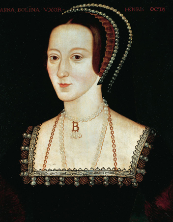 安妮·博林(1500—1536)。当代少有安妮的肖像,这幅肖像是从一个更早的版本中衍生而来的。她戴着一个因她而在宫廷流行的法国头饰,还戴着那个有名的字母“B”吊坠。
