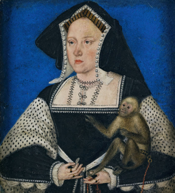 1525年卢卡斯·欧汉布(Lucas Horenbout)绘制的阿拉贡的凯瑟琳(1485—1536)。这幅肖像象征了凯瑟琳的虔诚。她给她的猴子一枚硬币,但是猴子选择了十字架。