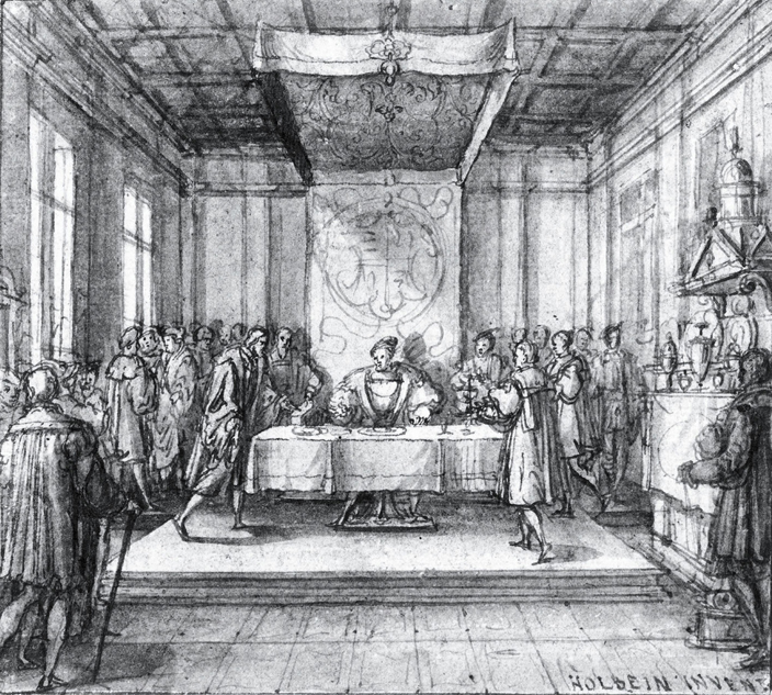 亨利八世在他的接见厅用餐。国王坐在一个华盖下面,身边环绕着宫廷的人。左侧手持木板的是他的高级廷臣们。