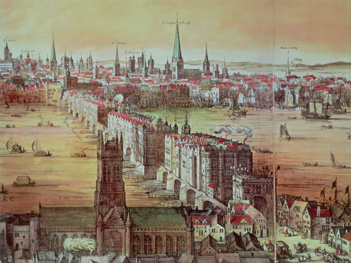 伦敦桥,1616年。叛徒的头颅被挂在入口处(位于图片右下角),克伦威尔在1540年也受到了同样的待遇。可以看到伦敦塔在河的对岸。