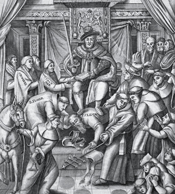 选自约翰·福克斯《伟绩与丰碑》中关于改革的寓言。这幅插图象征了亨利对教宗克雷芒的胜利,后者俯伏在亨利的脚前。克伦威尔和克兰默在亨利的右面,正在接过《圣经》。