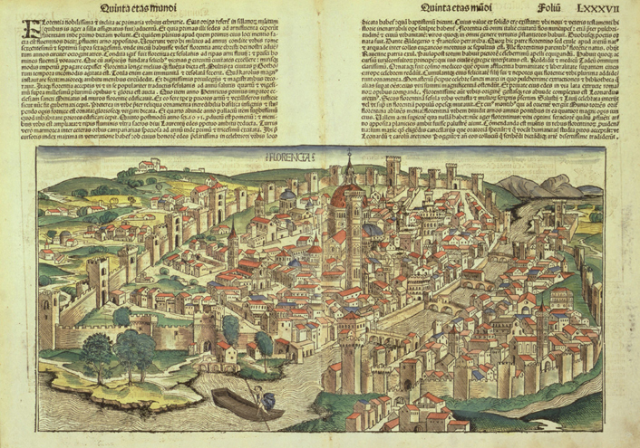 佛罗伦萨的风光,1493年。这是克伦威尔所熟知的城市,四周环绕着城墙,城中央是大教堂,大教堂圆顶是菲利波·布鲁内莱斯基(Filippo Brunelleschi)完成的。