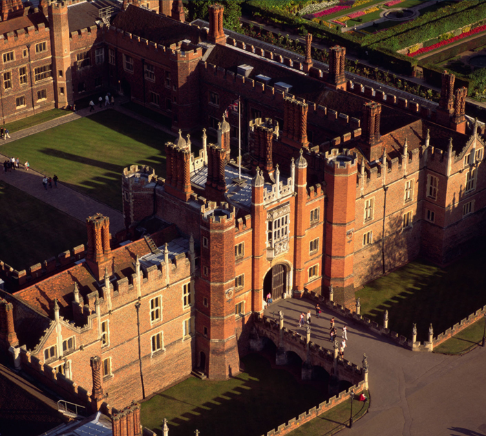 汉普顿宫。起初是由枢机主教沃尔西所建,亨利八世在前者失势的时候得到了它。国王立即开始扩充已有的庞大宫殿,增建了有名的“大厅”。