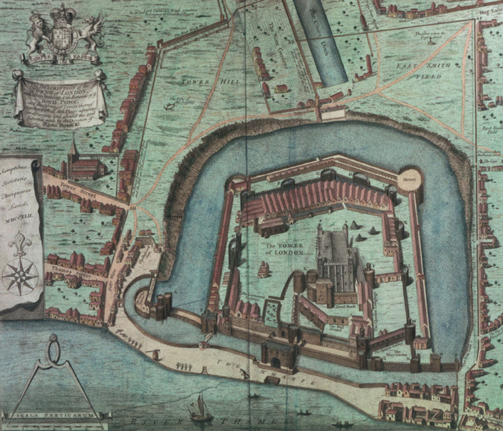 1597年的伦敦塔。代理官员的居所,即克伦威尔可能被关押的地方,位于左下方。圣彼得被囚礼拜堂,即克伦威尔遗骸被埋葬的地方,位于左上方。