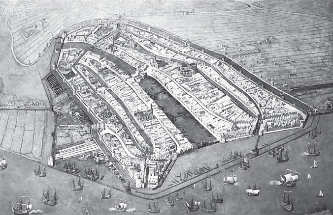共同孕育了纽约的“母”城:上图展现的是大约1616年的伦敦;下图是16世纪的阿姆斯特丹。( Library of Congress;Amsterdams Historisch Museum )