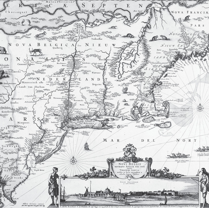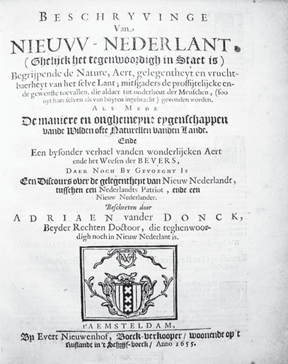 《新尼德兰记述》一书的扉页,这本书是阿德里安·范·德·邓克在背井离乡的情况下写成的,其中倾注了他对第二故乡的热情。(New York State Library)