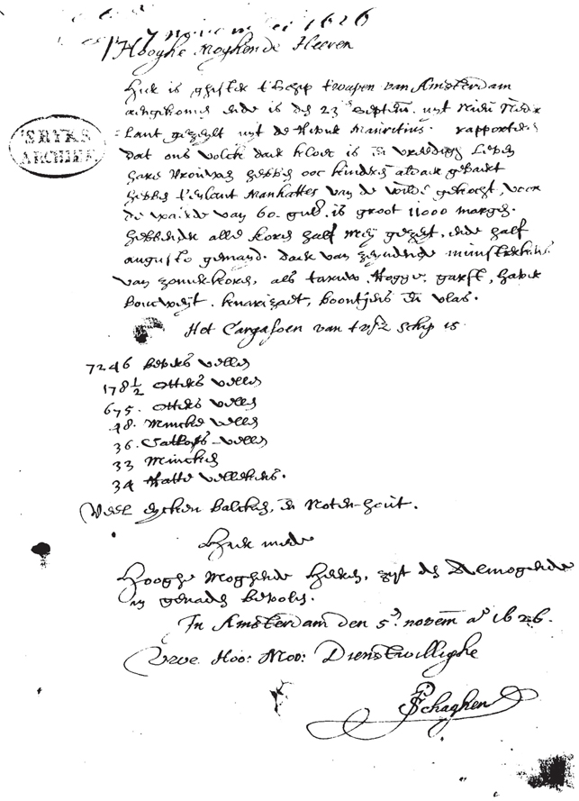 荷兰政府官员彼得·沙根在1626年写给他上司的信,信中提及殖民者“以价值60荷兰盾的物品从印第安人手中买下了曼哈顿岛”。( National Archives,The Hague )