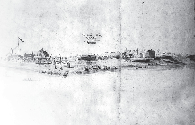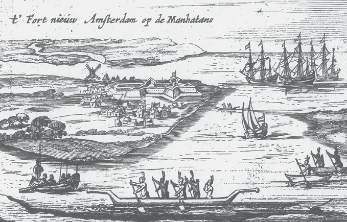 荷属曼哈顿最初的景象,时间大概是在彼得·米努伊特买下曼哈顿之后两年。这幅图描绘了堡垒、风车、一组房屋和被视为寻常存在的印第安人。( New York State Library )