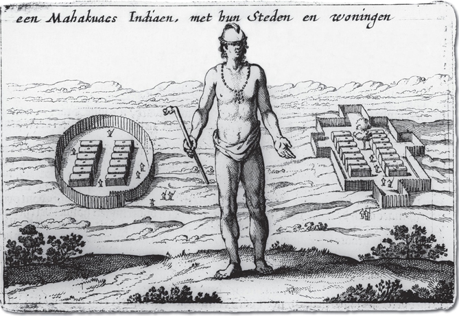 荷兰人对莫霍克印第安人和莫霍克长屋的描绘,画中的情形可以追溯到范·德·邓克在莫霍克部落中穿梭的时期。