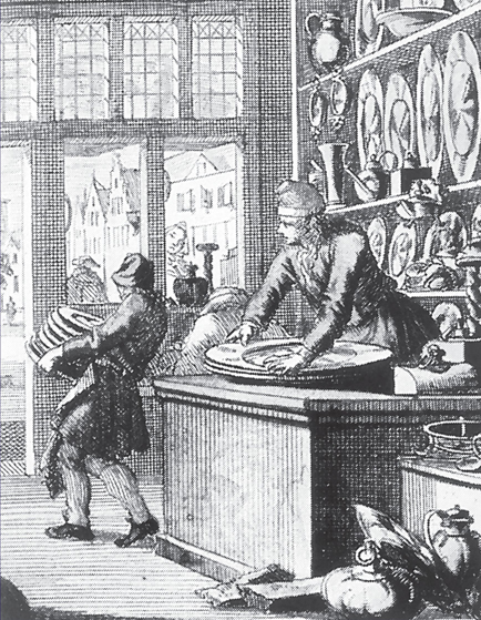 17世纪,一幅扬·吕肯雕刻的描绘荷兰“bass”(或称“老板”,在这幅作品中是一名锡匠)和他年轻学徒的版画。
