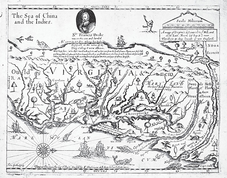 约翰·法雷的“弗吉尼亚”地图,它展示了当时的人们对北美的印象,这种印象在哈德逊航行数年后仍然普遍存在。此图中的方向是南在左,北在右。