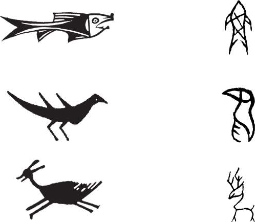 在原始图画和汉字的对比中,这样的例子还有很多。你看,自由自在的鱼儿、展翅欲飞的小鸟、姿态优雅的小鹿,这些原始绘画摇身一变,就成了最早的汉字。