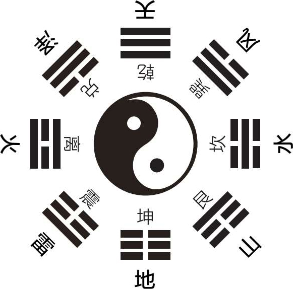 )表示阴爻,再用阴阳进行组合,就拼出了八卦,分别代表天、地、山、泽、水、火、风、雷。