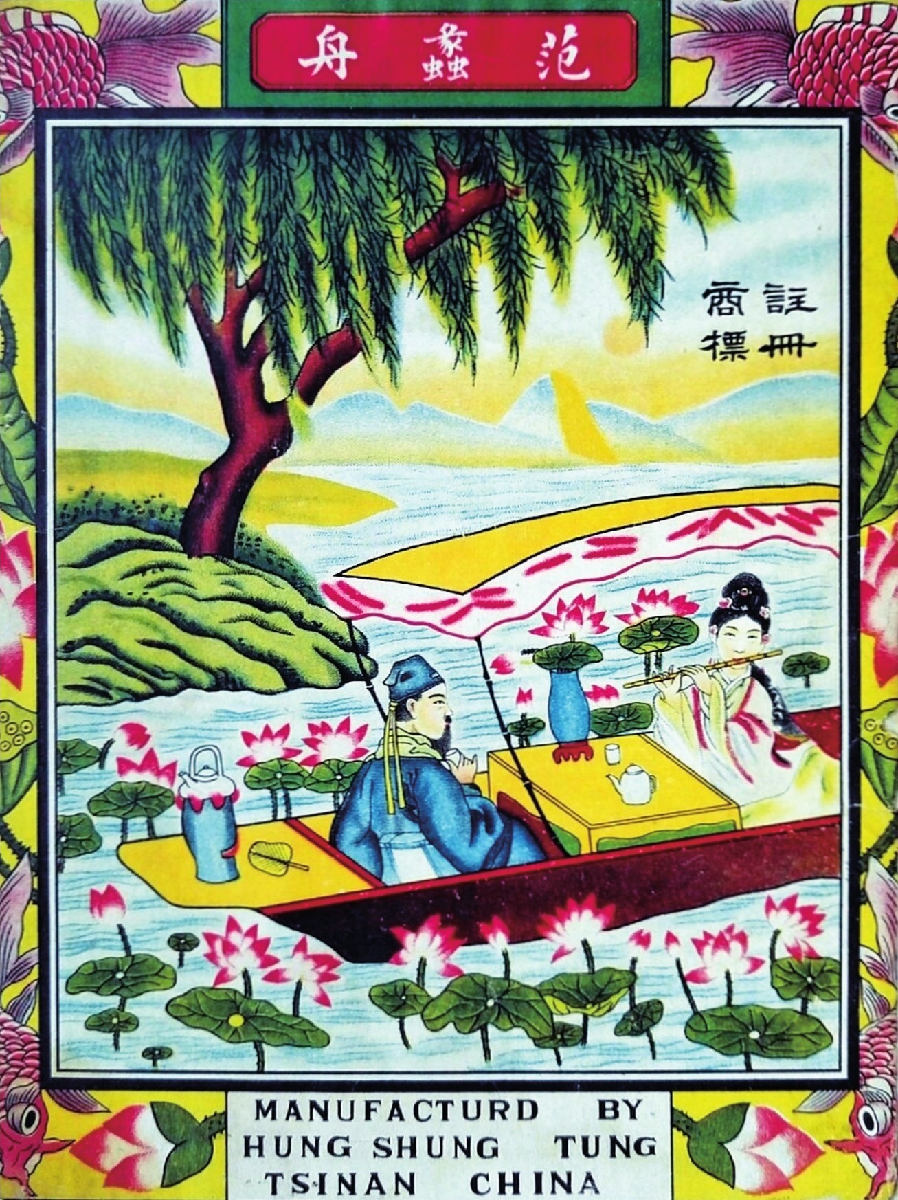 去年金秋时节,笔者在天津海河边旧书摊上淘到一张“范蠡舟”品牌老商标画,它是民国时期山东济南鸿顺东织染厂使用的布匹商标。当时,该品牌纺织品质量上乘,曾流行于沿海城市外国租界,并远销海外,缘此,鸿顺东在商标画上特别将厂商、地址等广告信息以英文来表述,方便外国人认知。有趣的是,这纸商标上描绘的正是我中华最浪漫的传说之一——范蠡与西施泛舟乐山乐水的故事。