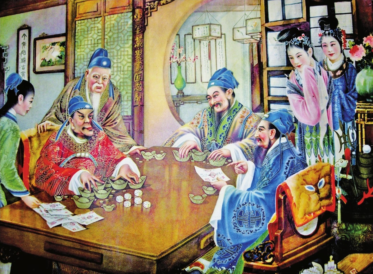笔者收藏有一幅20世纪30年代的月份牌广告画《明洪武豪赌图》,描绘的是朱元璋与江南巨富沈万三掷色子设赌游戏的情景。绘画者是大名鼎鼎的谢之光,其人在海派月份牌画坛享有“怪才”之誉。他见当时上海有不少人喜欢打麻将,遂突发灵感,于1935年应中国福新烟公司宣传嘉宝牌香烟之约,绘制了《明洪武豪赌图》。