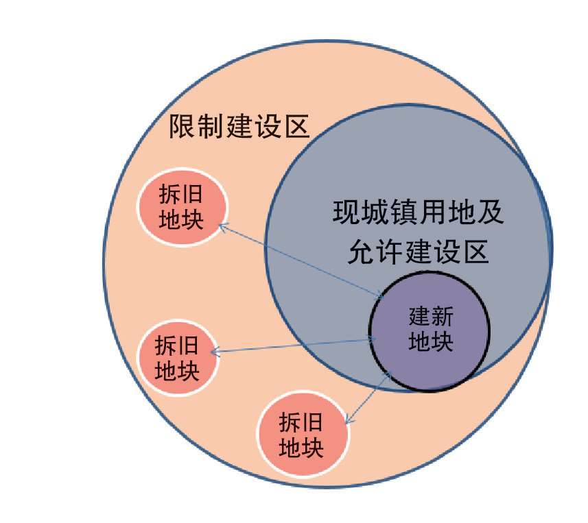 增减挂钩包括了拆旧区、建新区两个项目区。项目区的选择应符合土地利用总体规划,原则上拆旧区要位于限制建设区,建新区位于允许建设区。增减挂钩产生的指标是两个项目区紧密联系的核心和关键。(如图 2-1)