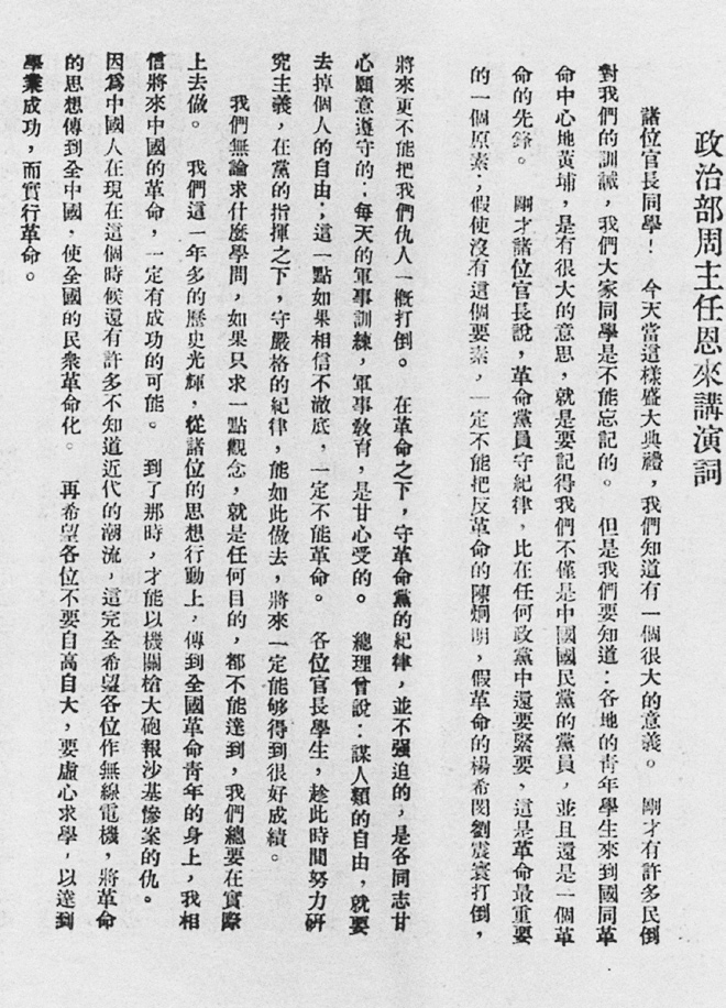 20世纪20年代,周恩来在广州黄埔军校(中国国民党陆军军官学校)第三期开学典礼上的演讲词。