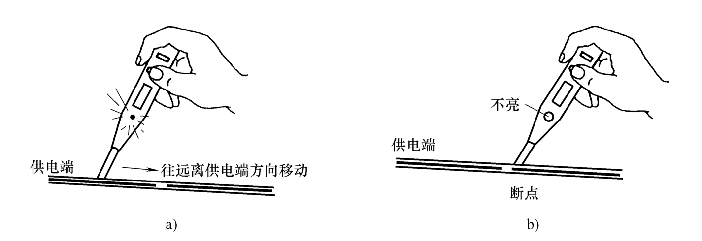 感应验电法非常适合判断绝缘导线内部断线位置。在测试时,手按住验电笔的感应测量按键,将验电笔的探头接触导线绝缘层,如果指示灯亮,表示当前位置的内部芯线带电,如图2-4a所示,然后保持探头接触导线的绝缘层,并往远离供电端的方向移动,当指示灯突然熄灭、高压符号消失,表明当前位置存在断线,如图2-4b所示。