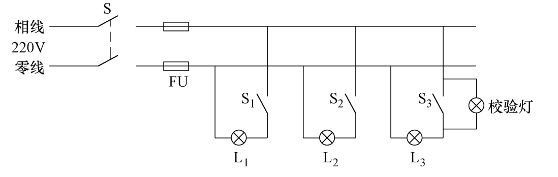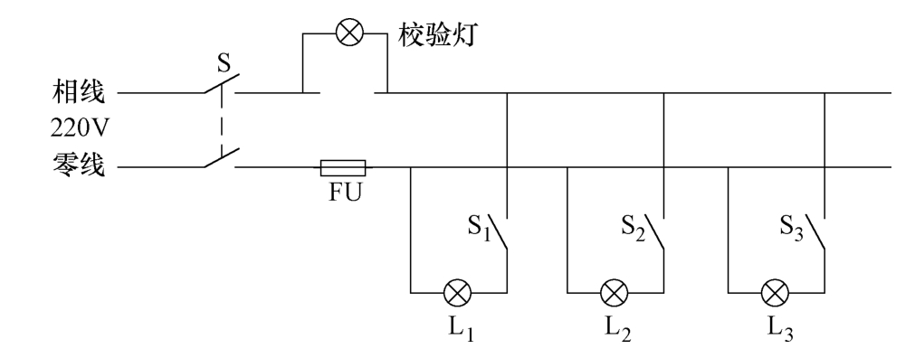 校验灯的使用如图2-6所示。在使用校验灯时,断开相线上的熔断器,将校验灯串在熔断器位置,并将支路的S 1 、S 2 、S 3 开关都断开,可能会出现以下情况: