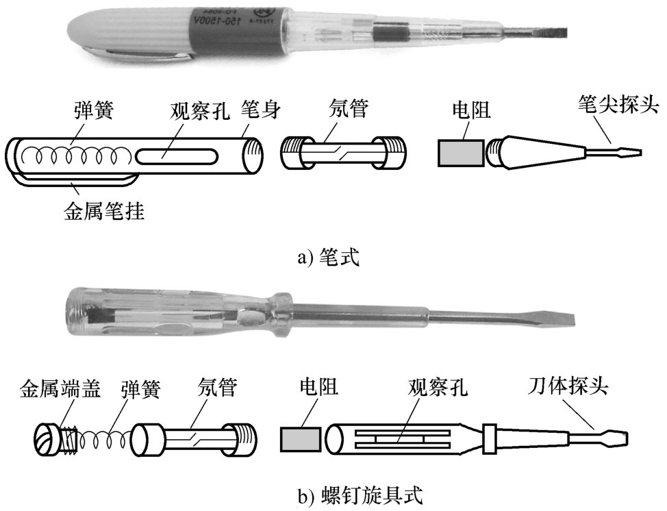 验电笔主要有笔式和螺钉旋具式两种形式,其外形与结构如图2-1所示。