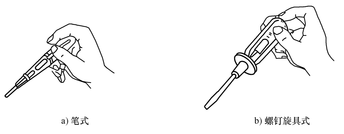 在握持验电笔验电时,手一定要接触验电笔尾端的金属笔挂(或金属端盖),验电笔的正确握持方法如图2-2所示,以让验电笔通过人体到大地形成电流回路,否则验电笔氖管不亮。普通验电笔可以检验60~500V范围内的电压,在该范围内,电压越高,验电笔氖管越亮,低于60V,氖管不亮。为了安全起见,不要用普通验电笔检测高于500V的电压。