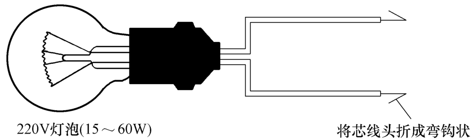 校验灯是用灯泡连接两根导线制作而成的,如图2-5所示。校验灯使用额定电压为220V、功率在15~60W的灯泡,导线用单芯线,并将芯线的头部弯折成钩状,既可以碰触电路,也可以钩住电路。