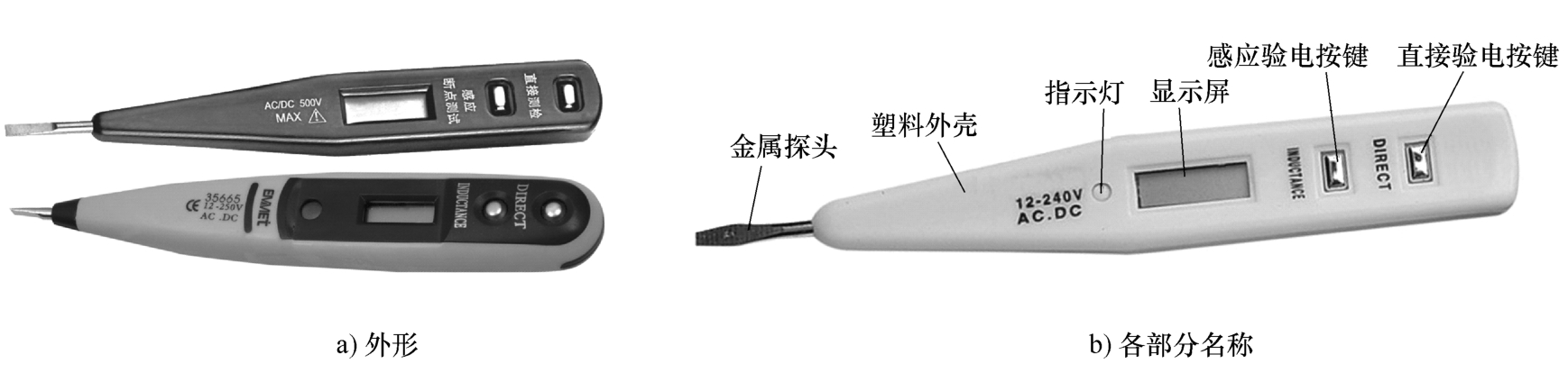 数显式验电笔的外形与各部分名称如图2-3所示,图2-3b所示的验电笔上标有“12-240V AC.DC”,表示该验电笔可以测量12~240V范围内的交流或直流电压,验电笔上的两个按键均为金属材料,验电时手应按住按键不放,以形成电流回路,通常直接验电按键距离显示屏较远,而感应验电按键距离显示屏更近。
