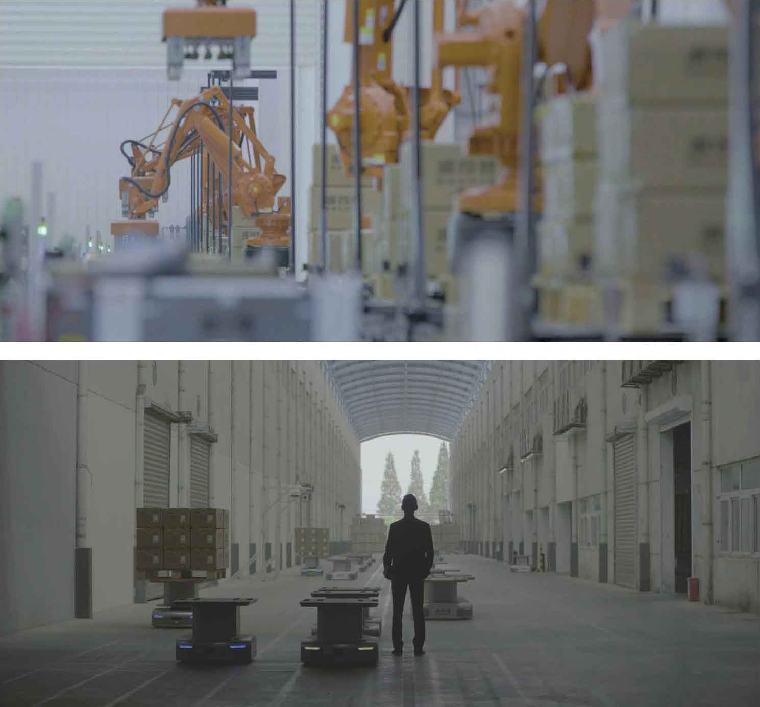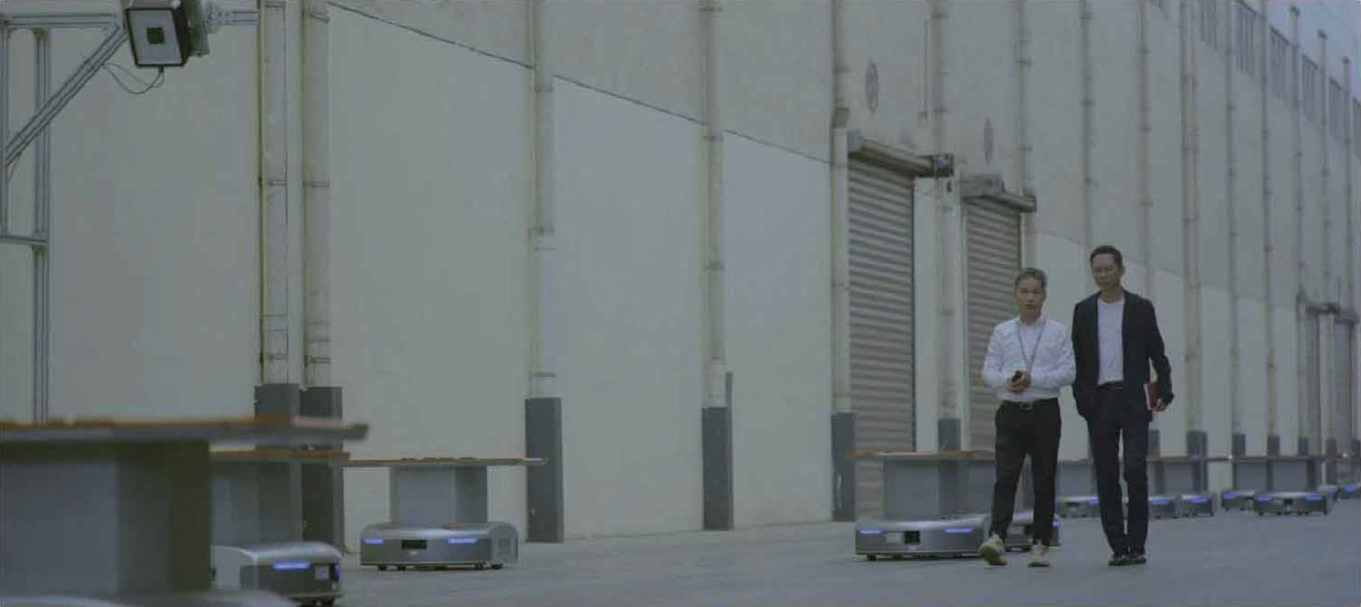 吴晓波与波司登集团智能配送中心总经理戴建国信步走在波司登厂房内,而身边的智能搬运机器人正在忙碌地工作
