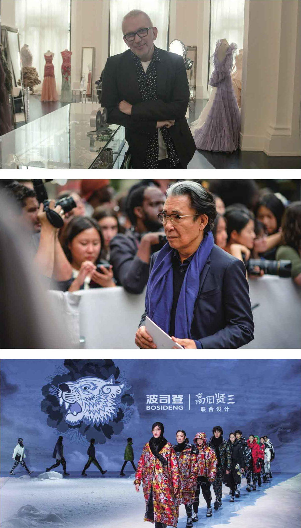 与波司登合作过的设计大师让-保罗·高缇耶(上)与高田贤三(中)波司登与高田贤三的联合设计款秀场(下)