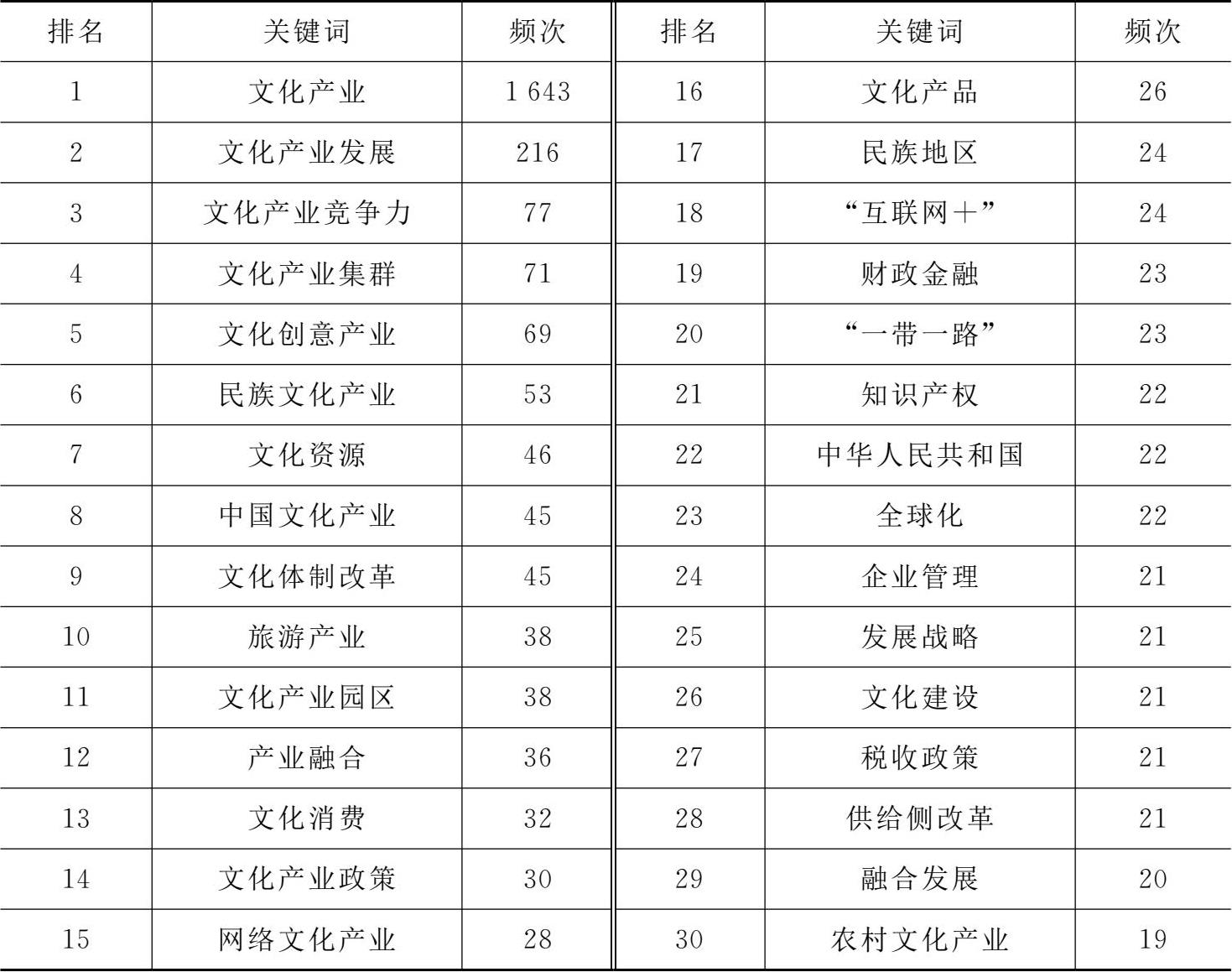 注:文化产业竞争力与竞争力、文化产业集群与产业集群、文化创意产业与创意产业、供给侧改革与供给侧,均为同一关键词的不同表达,已做归并处理,类似情况不再列举。