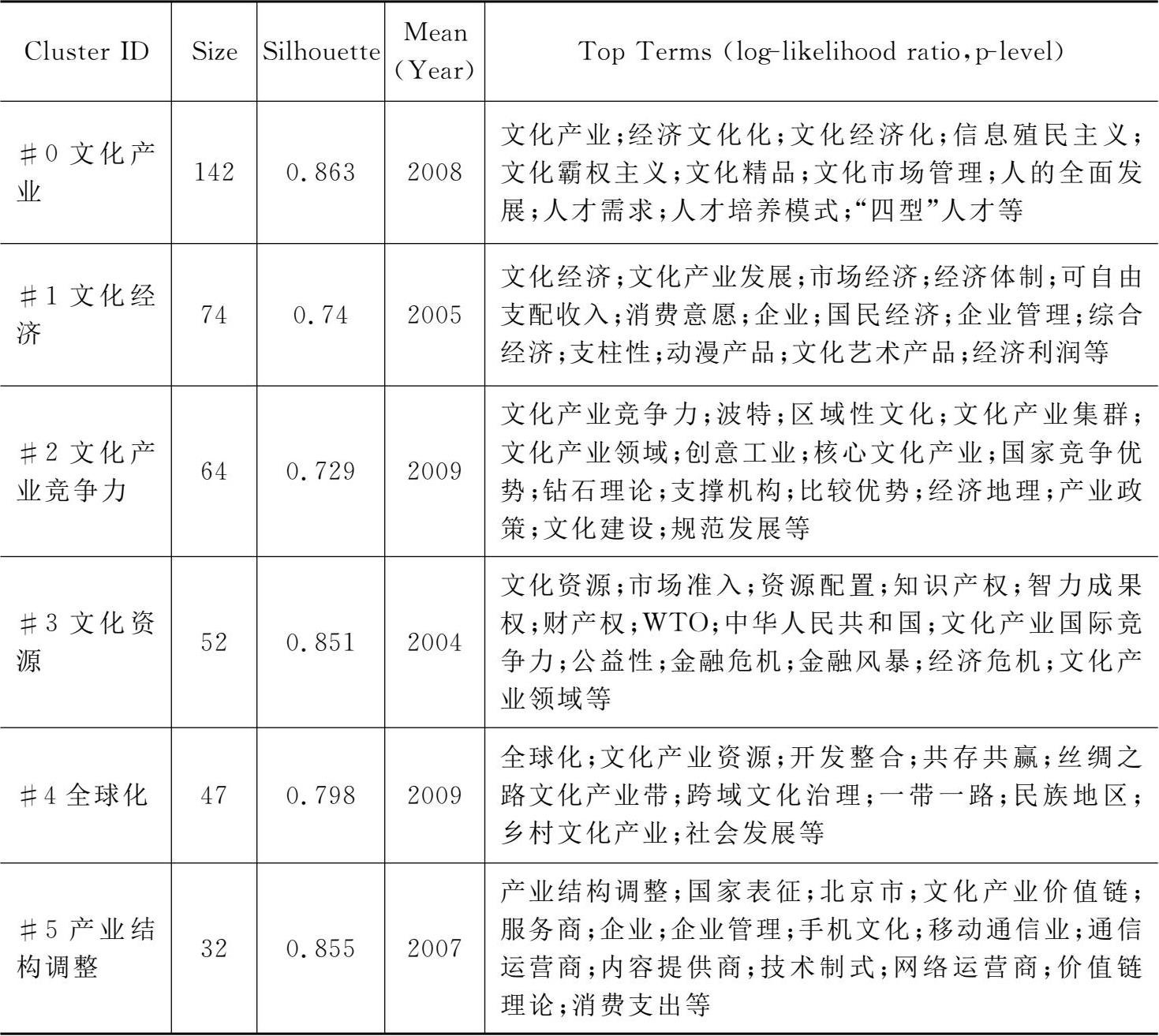 为了更好地显示热点主题的情况,将其做聚类分析,将聚类的形式设置为Log-Likelihood Ratio(LLR)Terms。从“Summary of Major Clusters”聚类主题信息汇总表和共词聚类视图可以看出目前我国文化产业领域的热点情况,如表 7所示。
