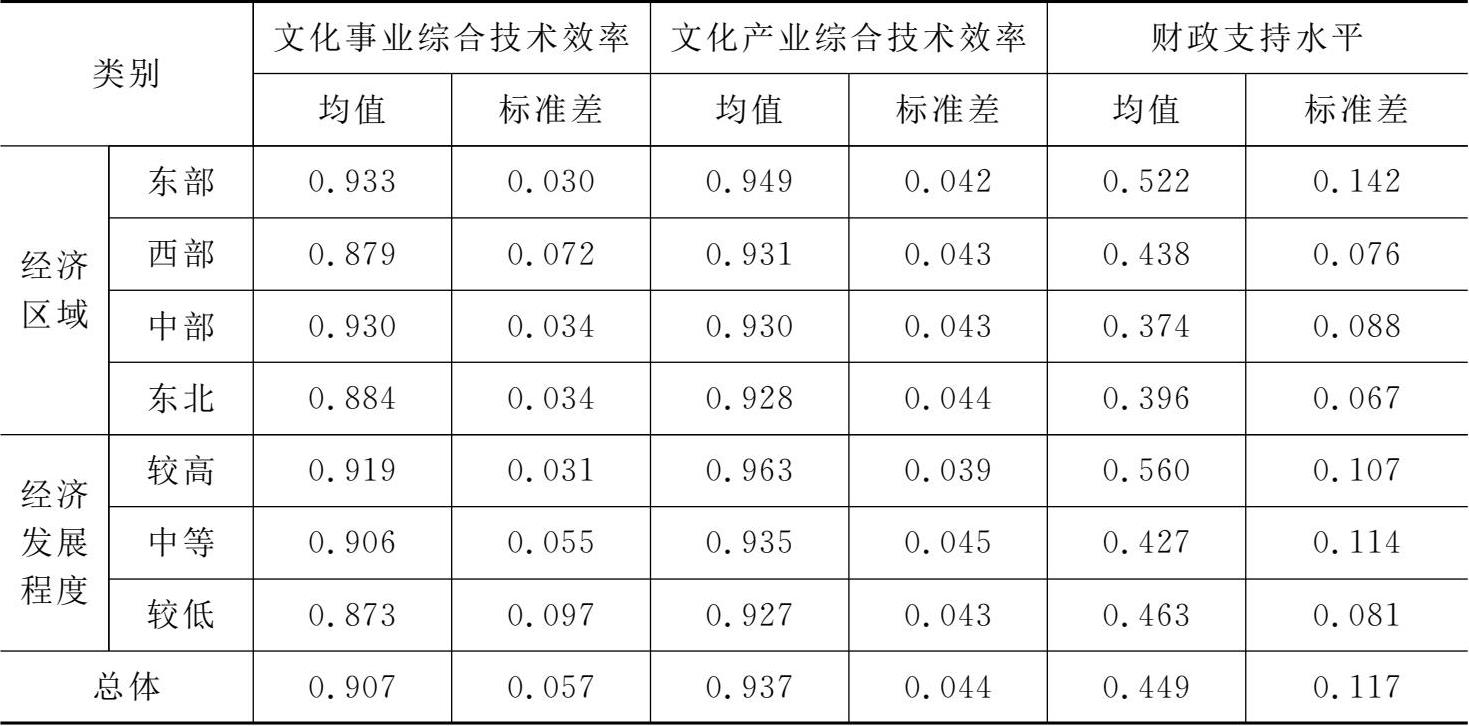 由表1可以看出:2004—2017年文化产业平均综合技术效率为0.937,文化事业平均综合技术效率为0.907。从各类来看,文化产业平均综合技术效率也不同程度地高于文化事业平均综合技术效率。就区域而言,仅仅东部地区以及经济发展程度较高的阶段或地区,文化产业、文化事业的综合技术效率高于全国总体均值水平。因此,综合技术效率水平根据经济发展水平的高低具有阶段性的差异,在四大区域中的表现也不尽相同。其中,比较特殊的是西部地区文化事业平均综合技术效率最低,但文化产业平均综合技术效率高于中部地区和东北地区。另外,西部地区虽然经济发展程度较低,但是政府对于文化事业的财政支持力度却仅次于东部地区,高于中部和东北地区。