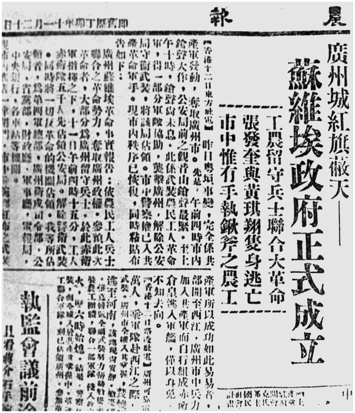1927年12月11日凌晨,在中共广东省委领导下,张太雷、叶挺、叶剑英等指挥国民革命军第四军教导团、警卫团一部和广州工人赤卫队共6000余人,在广州举行起义。起义当天,即宣布成立广州苏维埃政府,中共临时中央政治局委员、著名的工人运动领袖苏兆征任主席,因苏兆征暂未到任,由张太雷代理主席。广州苏维埃政府设内务、军事、劳动、土地、教育、外交、经济、司法、肃反等委员会,以张太雷兼任人民军事委员,恽代英任政府秘书长,叶挺任工农红军总司令,杨殷任人民肃反委员,周文雍任人民劳动委员,彭湃任人民土地委员(由赵自选代理),陈郁任人民司法委员,何来任人民经济委员。