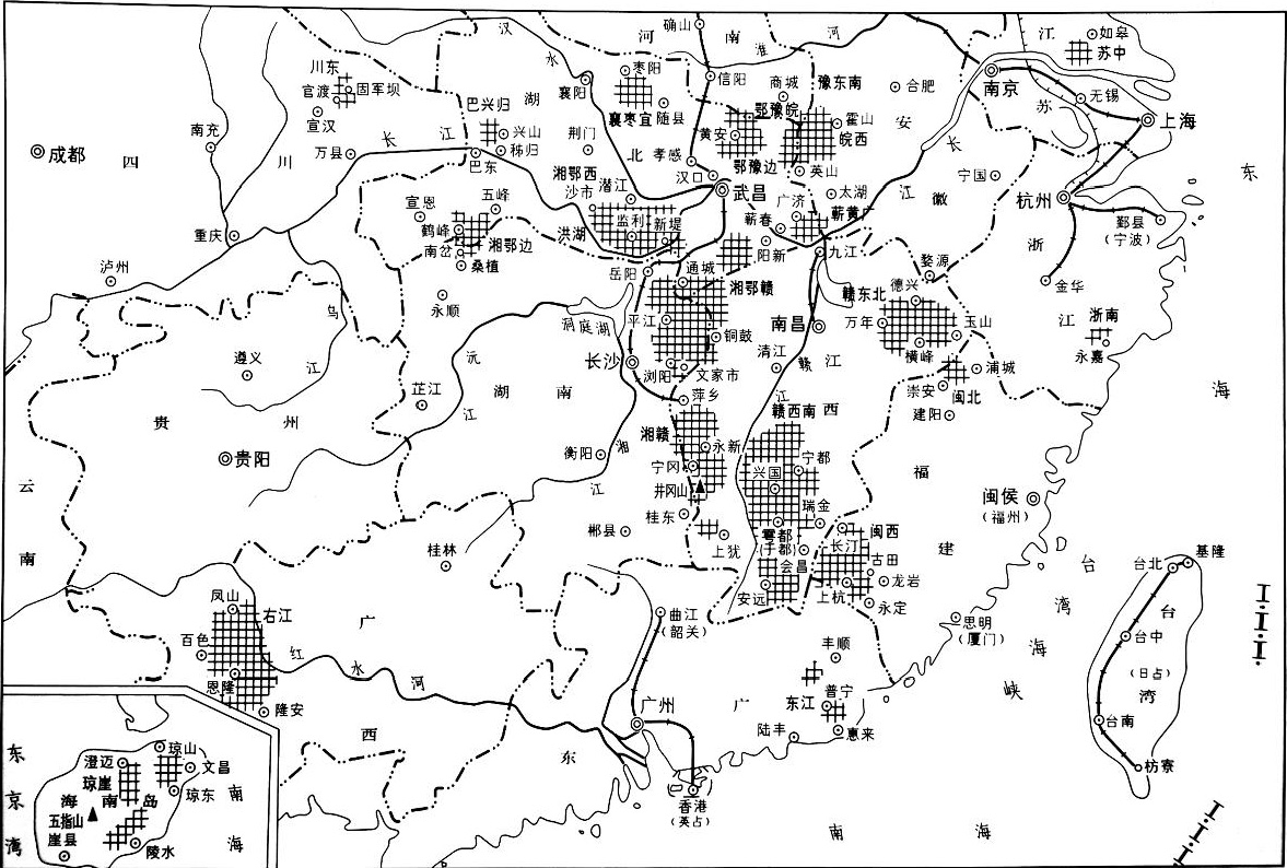 1930年夏全国农村革命根据地形势图(据中共中央党史研究室著《中国共产党历史》第一卷上册附图6制作)