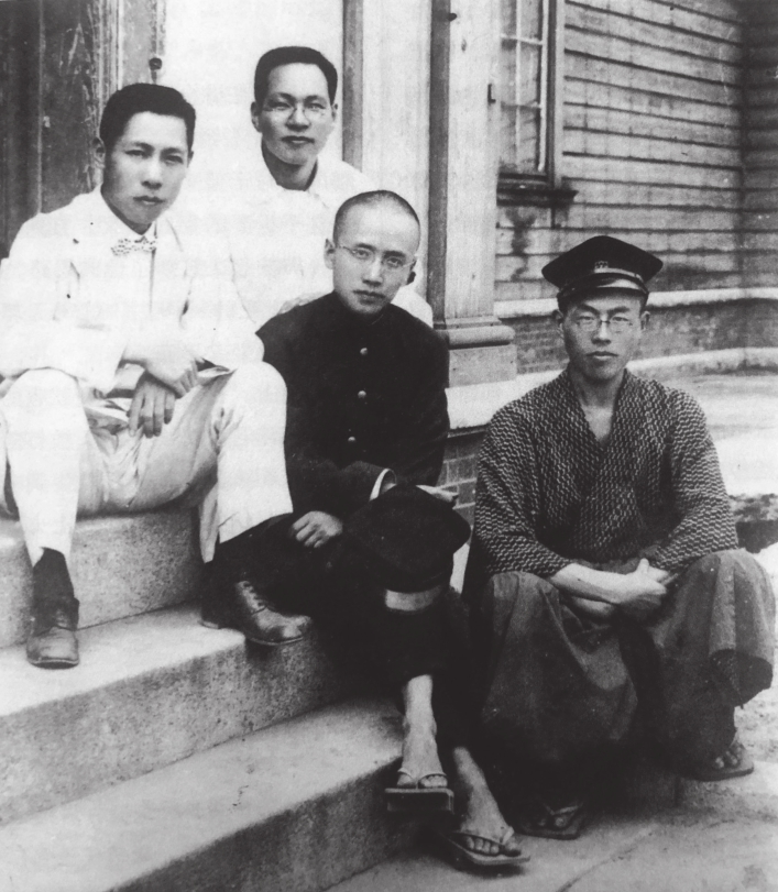 ◎ 1919年前后,摄于日本九州帝国大学,郭沫若(右二)与留日学生成立“夏社”,写文章揭露日本政府的扩张行径并自费印刷发往国内(左一为徐诵明、右一为夏禹鼎)