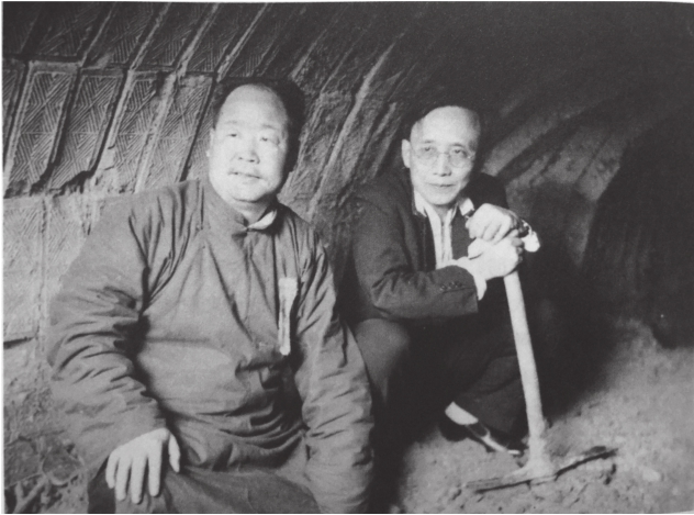◎ 1940年春,重视文物考古的郭沫若与卫聚贤(左)在嘉陵江北岸汉墓发掘现场