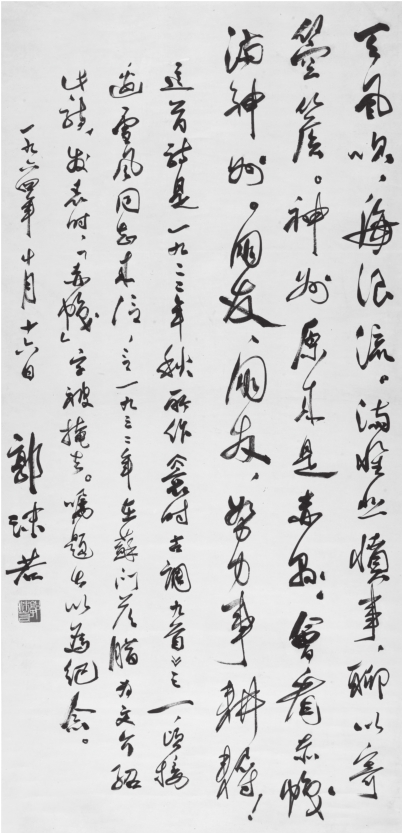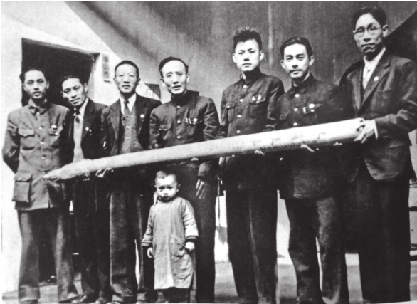 ◎ 1941年11月16日,庆祝郭沫若五十诞辰暨创作生活二十五周年纪念活动中的合影。文化工作委员会和日本反战同盟自制巨笔作为生日礼物,上刻有“以清妖孽”四字(左起:石凌鹤、罗髫渔、乐嘉煊、郭沫若、刘仁、冯乃超、郭劳为)