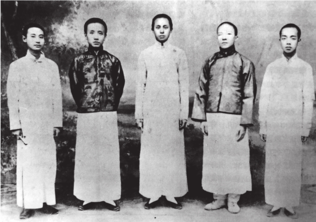 ◎ 1912年,剪掉辫子的郭沫若与小学同学合影(左起:吴尚之、郭沫若、陈衡浦?张其济、李茂根)