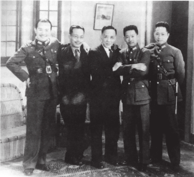 ◎ 1938年,郭沫若与黄琪翔(左一)、陈铭枢(左二)、张发奎(右二)、叶挺(右一)摄于武汉新四军办事处